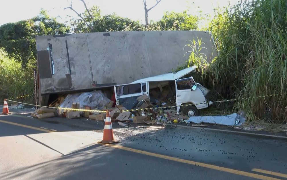 Duas pessoas morreram e outras duas ficaram feridas em um acidente que envolveu um caminhão, uma picape e um furgão na Rodovia Joaquim Cândido Ferreira (SP-338), por volta das 6h30 desta quarta-feira (27), em Cajuru (SP).