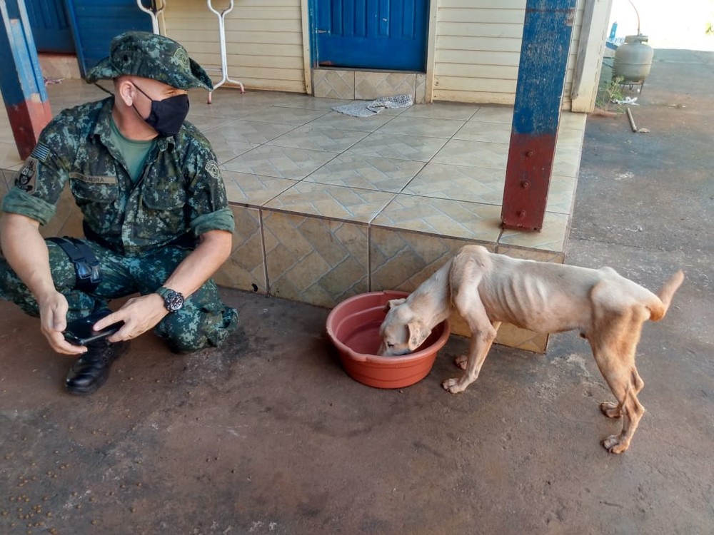No local, a Polícia Militar Ambiental constatou que o cachorro estava sem alimentação e água, desnutrido e infestado com muitos carrapatos.