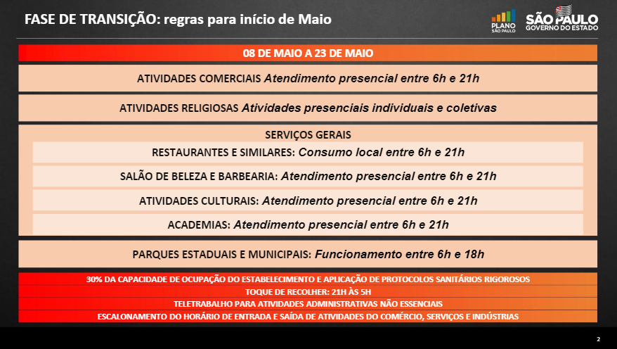 O Governador João Doria confirmou nesta sexta-feira (7) uma nova prorrogação da fase de transição do Plano São Paulo para todo o estado por mais duas semanas, até o próximo dia 23. O estado continua registrando redução gradual de indicadores de casos, internações e mortes por COVID-19. Isso permitiu a extensão de mais uma hora no expediente de atendimento presencial, das 6h às 21h, e com limitação de 30% de capacidade em comércios e serviços não essenciais.