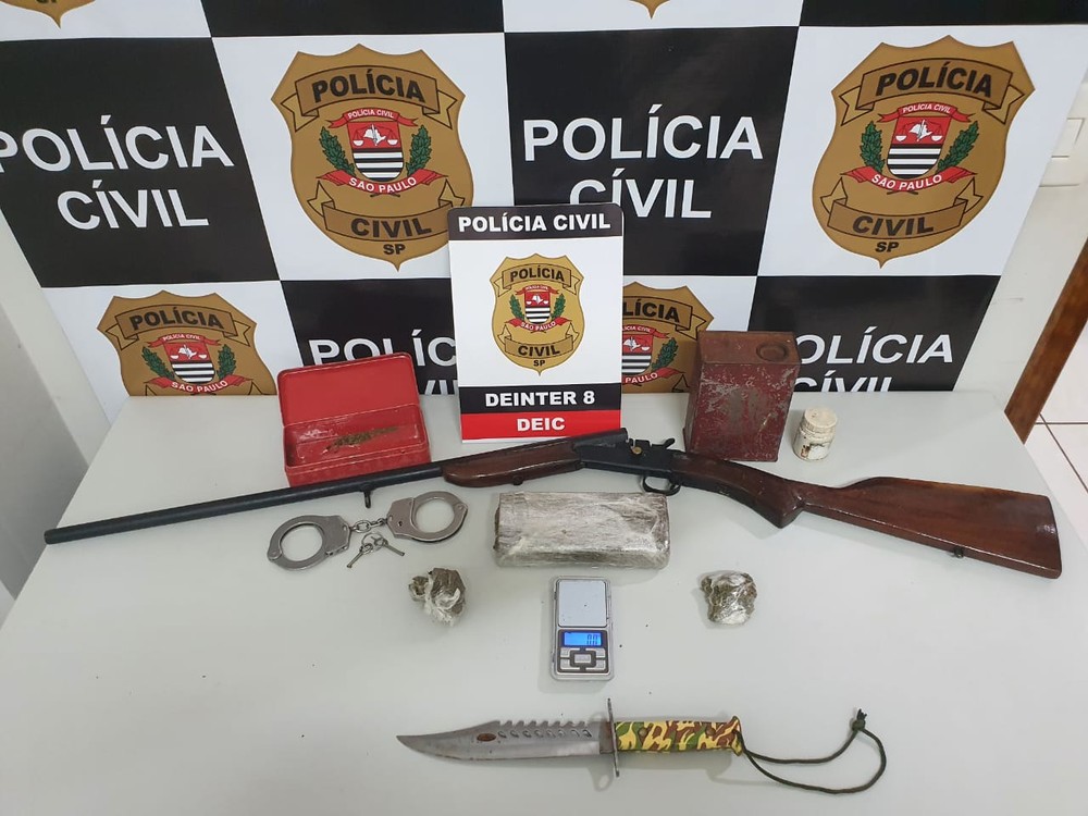 Em buscas na casa do indiciado, no Jardim Bongiovani, foram encontrados também uma balança de precisão com resquícios de maconha, um poto com mais entorpecente. Havia também uma arma de fogo, sem numeração, aparentemente de calibre 28, “cujos componentes de acionamento e disparos estavam íntegros, indicando encontrar-se em pronta condição de efetuar disparos”.
