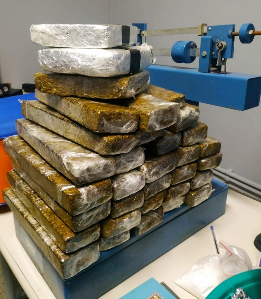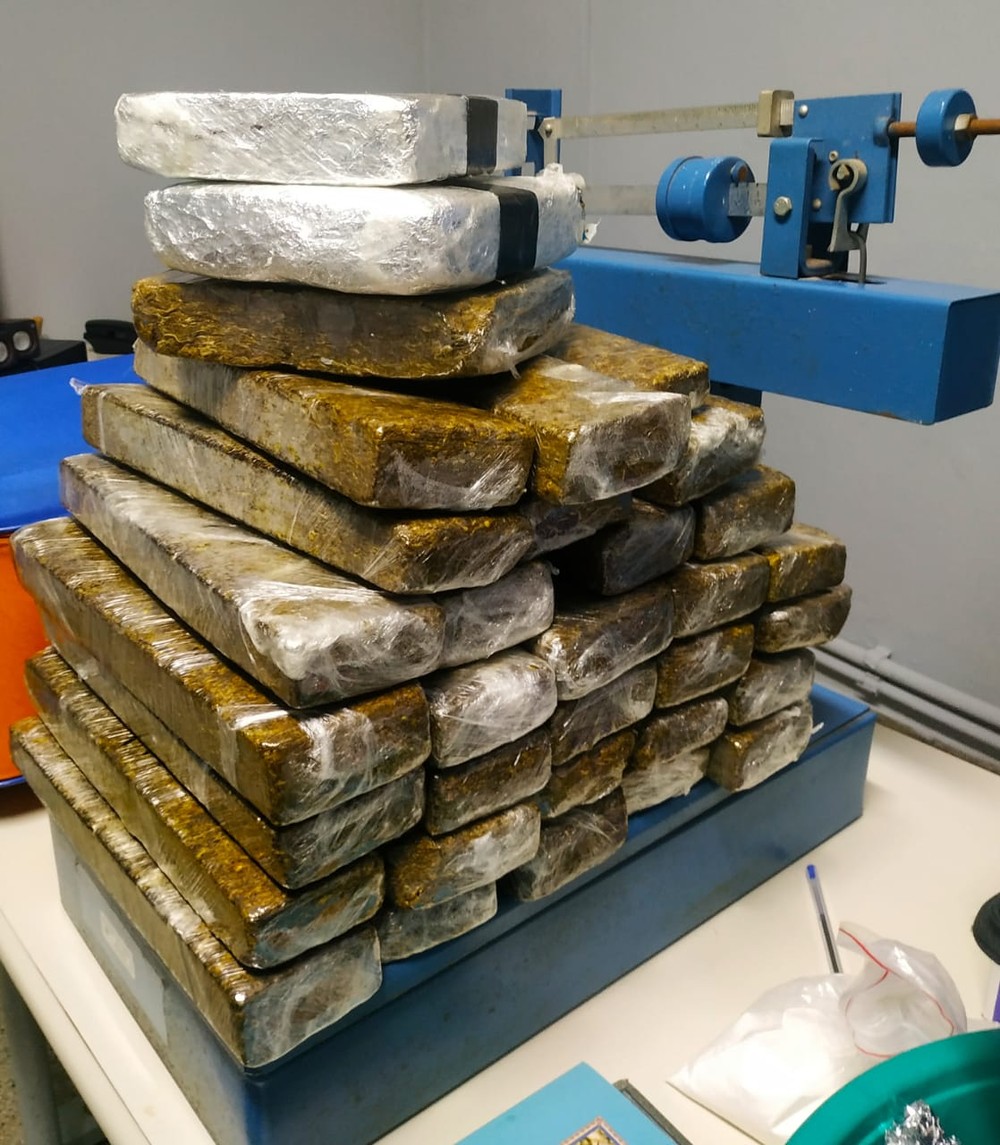 Na vistoria da casa, os policiais localizaram em um dos quartos uma caixa de papelão e dentro dela 33 tijolos de maconha. Ao lado, em uma bacia, foram encontrados papéis filme, saquinhos zip e R$ 259,70, além de 3,10 euros, uma balança de precisão e um saco plástico contendo cocaína.