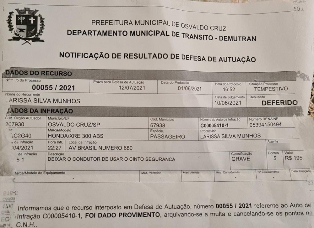 Após apresentação de recurso pelo recebimento de uma multa de trânsito por falta de uso do cinto de segurança na condução de motocicleta que a moradora de Osvaldo Cruz (SP), Larissa Silva Munhos, de 24 anos, havia recebido pelo Departamento Municipal de Trânsito (Demutran), o caso teve um desfecho nesta quinta-feira (1º).