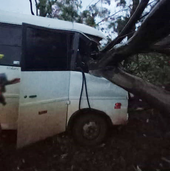 Micro-ônibus bate de frente em árvore caída em estrada vicinal e três pessoas ficam feridas