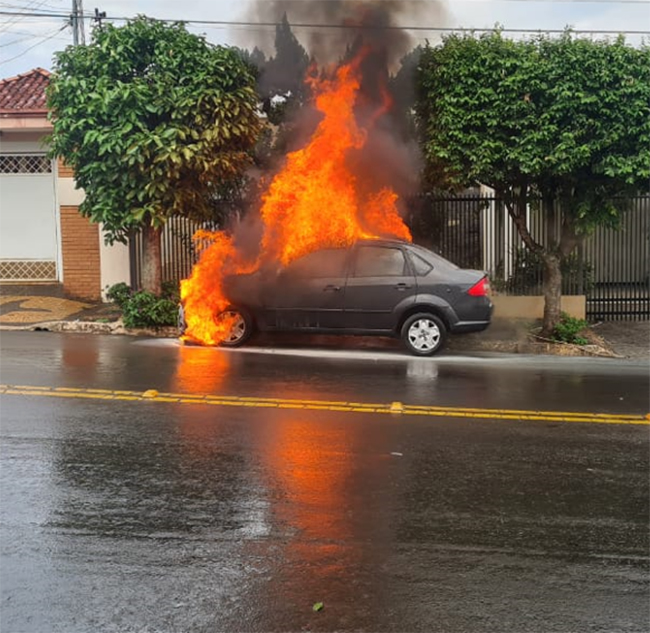 Ocupado por uma mulher e duas crianças, um veículo Ford Fiesta pegou fogo na manhã desta segunda-feira (19) em Tupã.