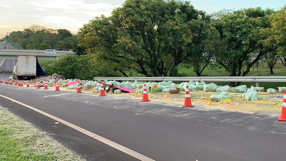 O trânsito no local flui por uma pista até que a carga tombada seja totalmente retirada do trecho.