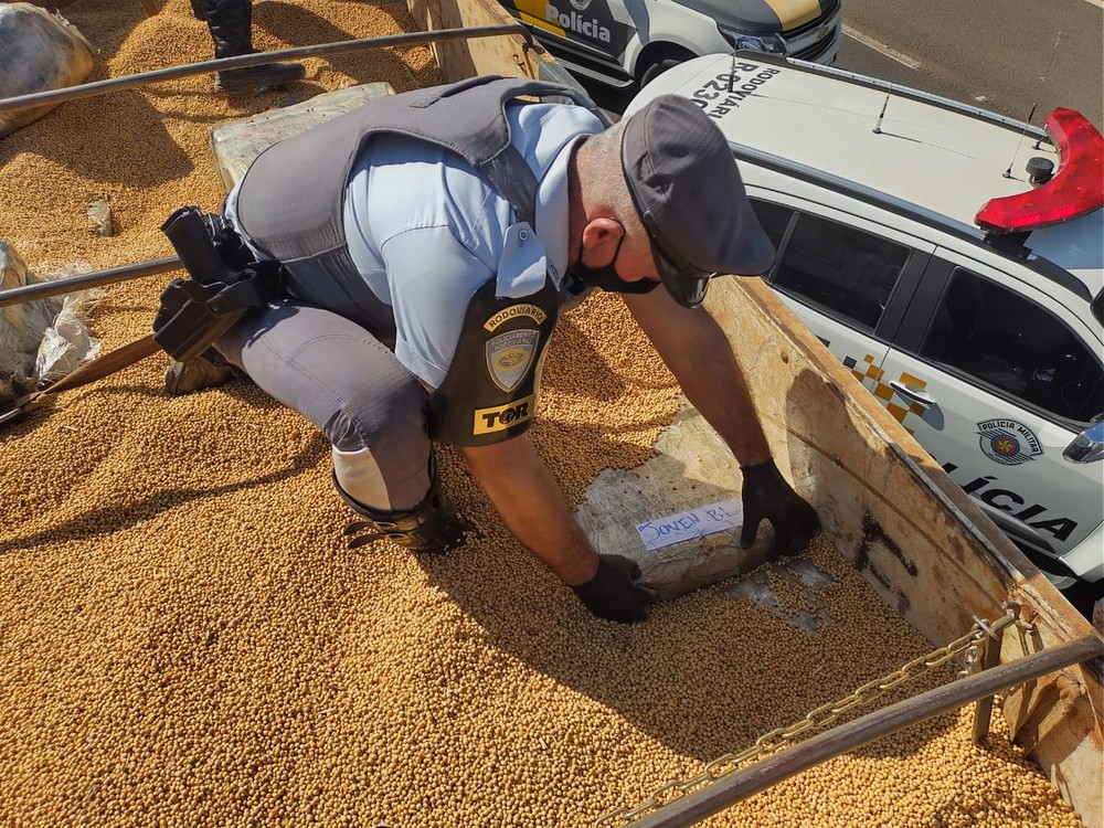 A droga estava distribuída em fardos escondidos no meio da carga de grãos de soja que o veículo transportava.