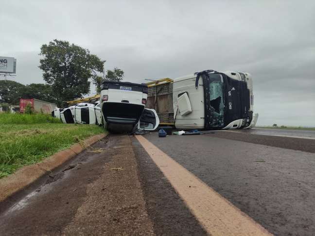 De acordo com reportagem da TV Anhanguera – em apuração com a Polícia Rodoviária – o motorista do caminhão perdeu o controle do veículo, bateu em uma guia e acabou tombando, derrubando os veículos na via.