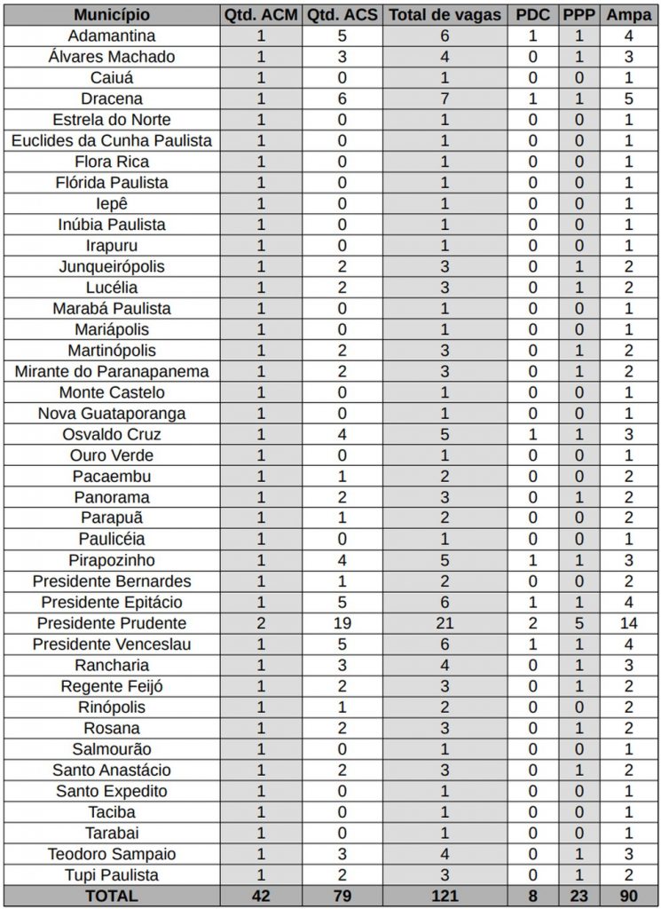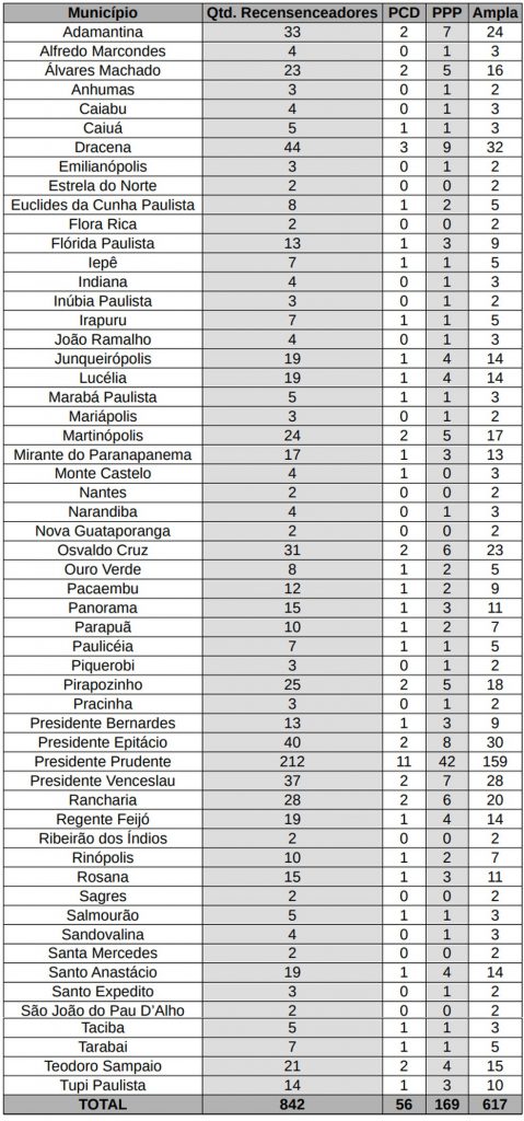 - Total de vagas no Oeste Paulista: 842, sendo 56 para Pessoas com Deficiência (PcDs), 169 para Pessoas Pretas ou Pardas (PPPs) e 617 na categoria Ampla.
