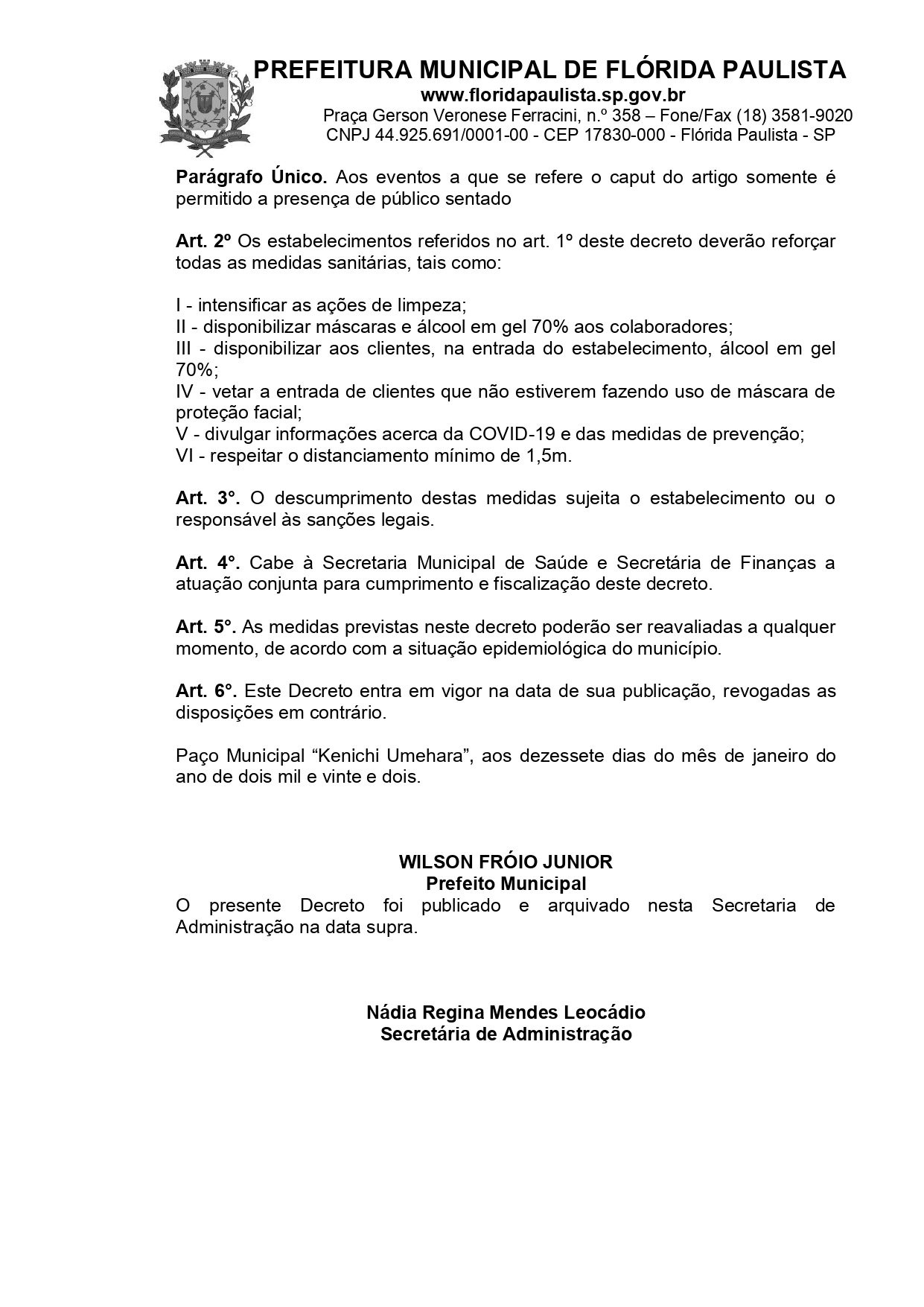 Visando “frear” o avanço do contágio com o Covid-19 em Flórida Paulista, a Prefeitura Municipal fixou através do decreto 004 de 17 de janeiro de 2021, medidas temporárias e emergenciais de prevenção à doença estabelecendo novas normas.