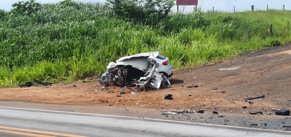 Segundo a Polícia Rodoviária, o carro bateu em um caminhão que estava no sentido contrário da pista. A frente do veículo ficou destruída.