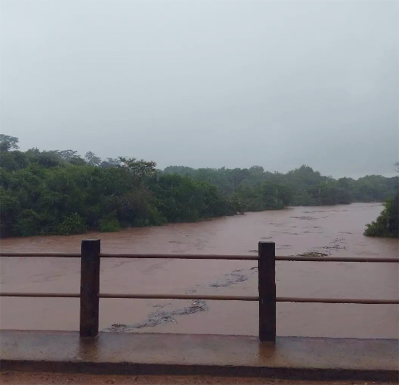 A água do rio estava bem alta e próxima de alcançar a plataforma da ponte, galhos e outros objetos eram levados pela forte correnteza. Já embaixo da ponte, a agua inundou parte da vegetação.