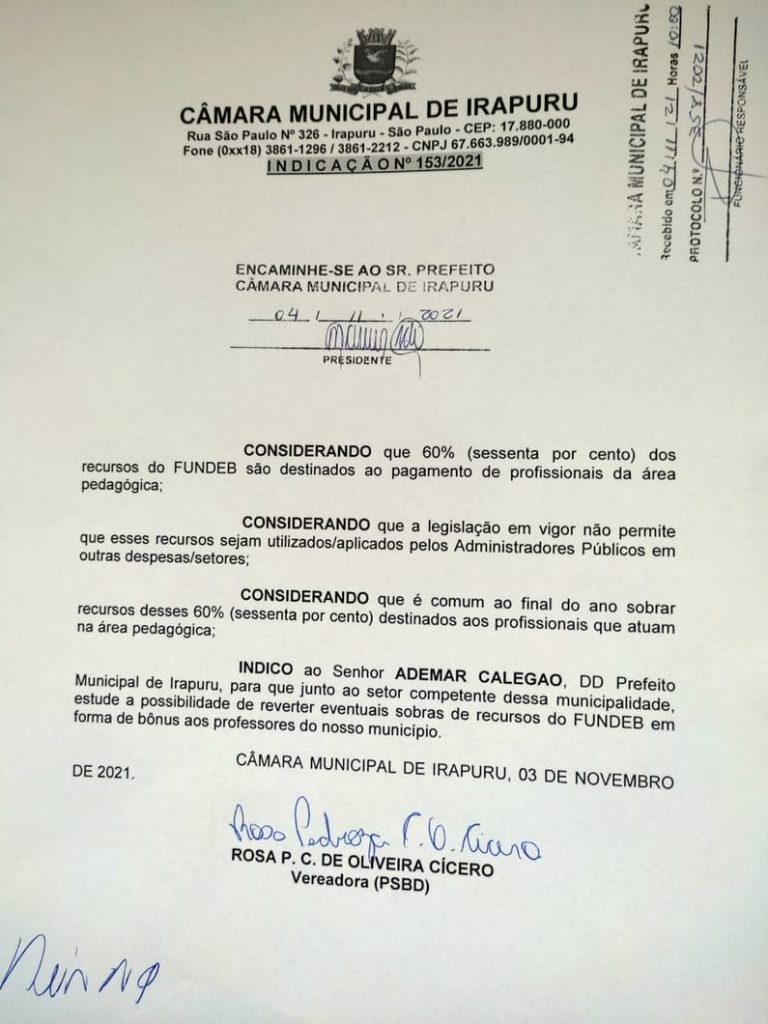 O pagamento do abono Fundeb atende pedido da vereadora Rosa Cicero (PSDB) que apresentou na Câmara Municipal de Irapuru, no dia 3 de novembro, a Indicação nº 153/2021 solicitando ao prefeito reverter eventuais sobras de recursos do Fundeb em forma de bônus aos professores do município.