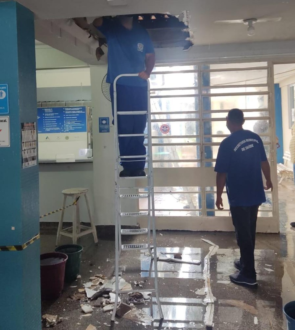 De acordo com as informações repassadas pela Prefeitura, o que aconteceu na unidade de saúde foi um problema com a calha, que só tem um condutor e, devido ao volume de água da chuva, transbordou e voltou para o forro, que é de gesso.