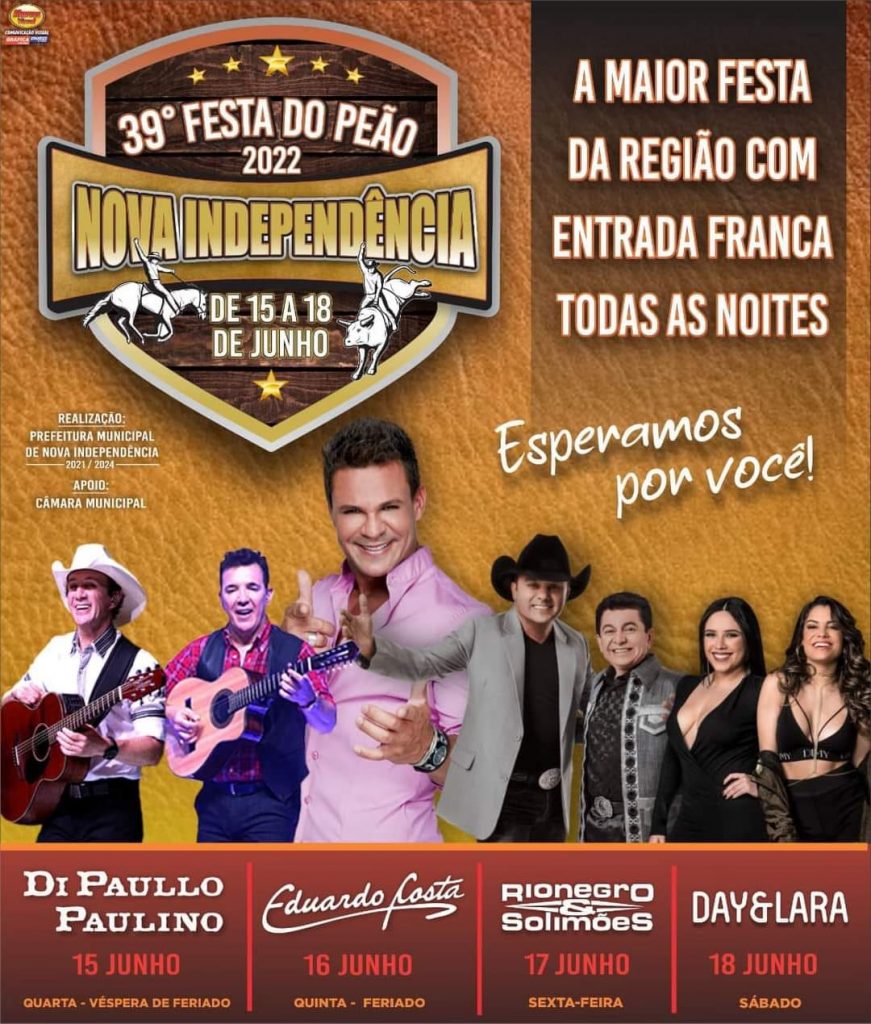 A Prefeitura de Nova Independência, estará realizando de 15 a 18 de junho, a 39ª Festa do Peão de Nova Independência, com shows de Di Paullo e Paulino, Eduardo Costa, Rio Negro e Solimões e Day & Lara, com entrada franca todas às noites e em breve novas outras atrações deverão estar sendo divulgadas.