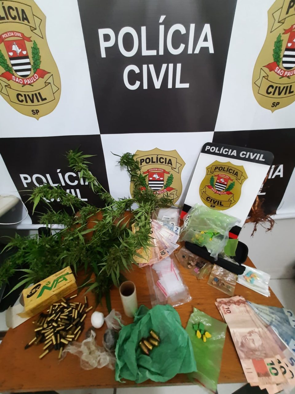 Na residência, a especializada apreendeu um pé de maconha; uma porção da mesma droga, uma de haxixe e uma cocaína; seis comprimidos provavelmente de ecstasy, sendo três de cor verde e três amarelos; cinco munições de arma calibre 380; 68 munições calibre 22; um rolo pequeno de plástico filme; e vários saquinhos comumente utilizados para embalar drogas.