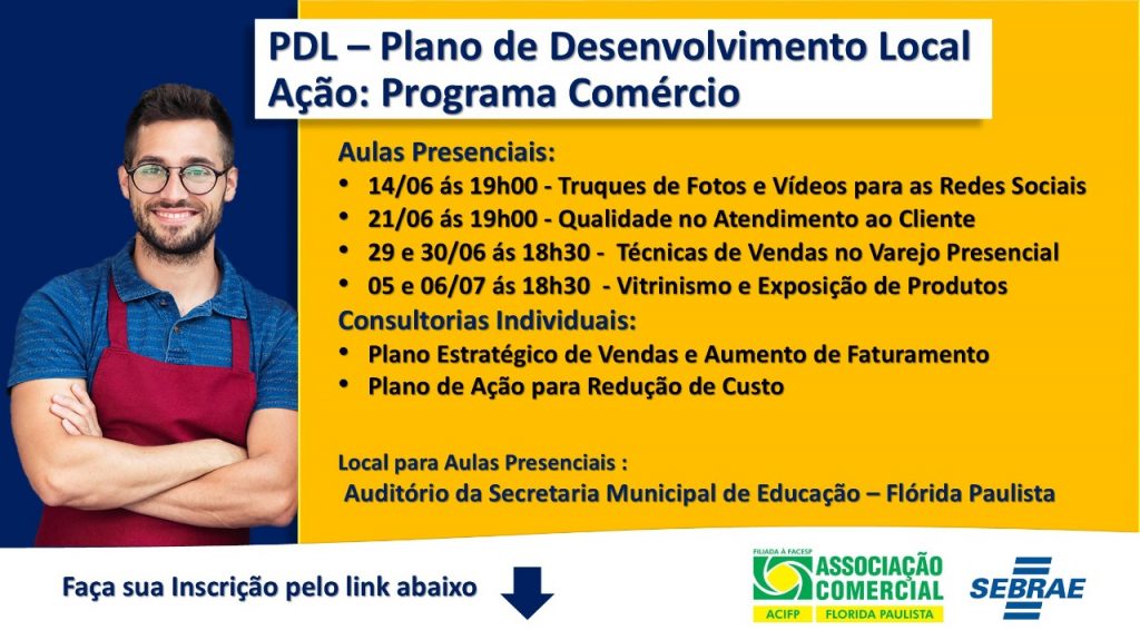 Seguem abertas ainda nesta segunda-feira (13), as inscrições para mais uma ação do Plano de Desenvolvimento Local (PDL), realizado em parceria entre o SEBRAE e Associação Comercial de Flórida Paulista.