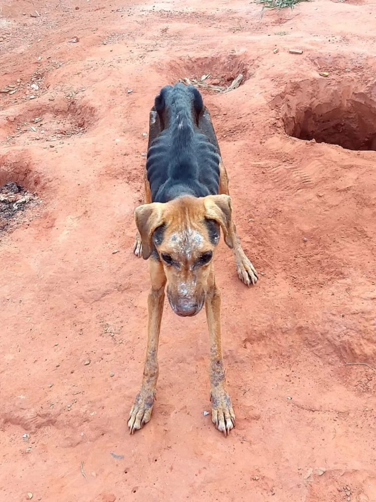 No quintal, os policiais encontraram cadela sem raça definida em situação de maus-tratos, com magreza excessiva, infestada de parasitas, sem água e sem alimentação disponíveis.