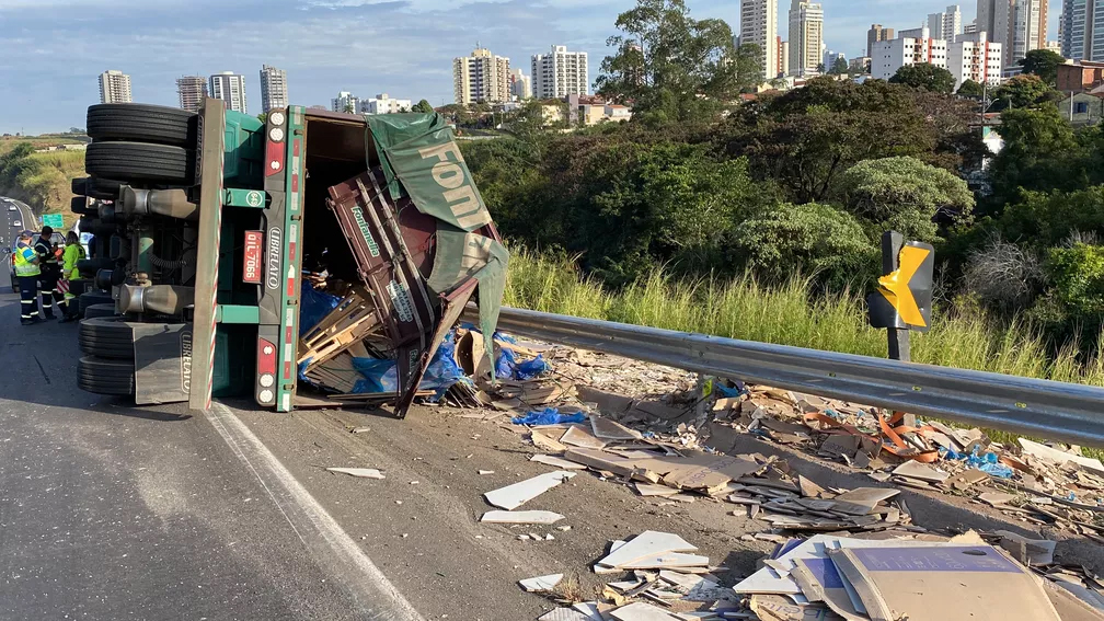 O caminhão carregado com piso tombou no quilômetro 447 no sentido Bauru-Marília. De acordo com a Polícia Rodoviária, o motorista de 39 anos disse que perdeu o controle do veículo, pois estava mexendo no celular.