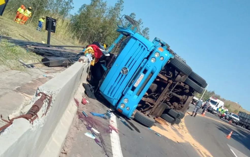 Segundo a Polícia Rodoviária, parte da carga de canos de metal caiu fora da pista, no acostamento depois da mureta de proteção. Por causa do vazamento de óleo, foi jogado pó de serra no asfalto.