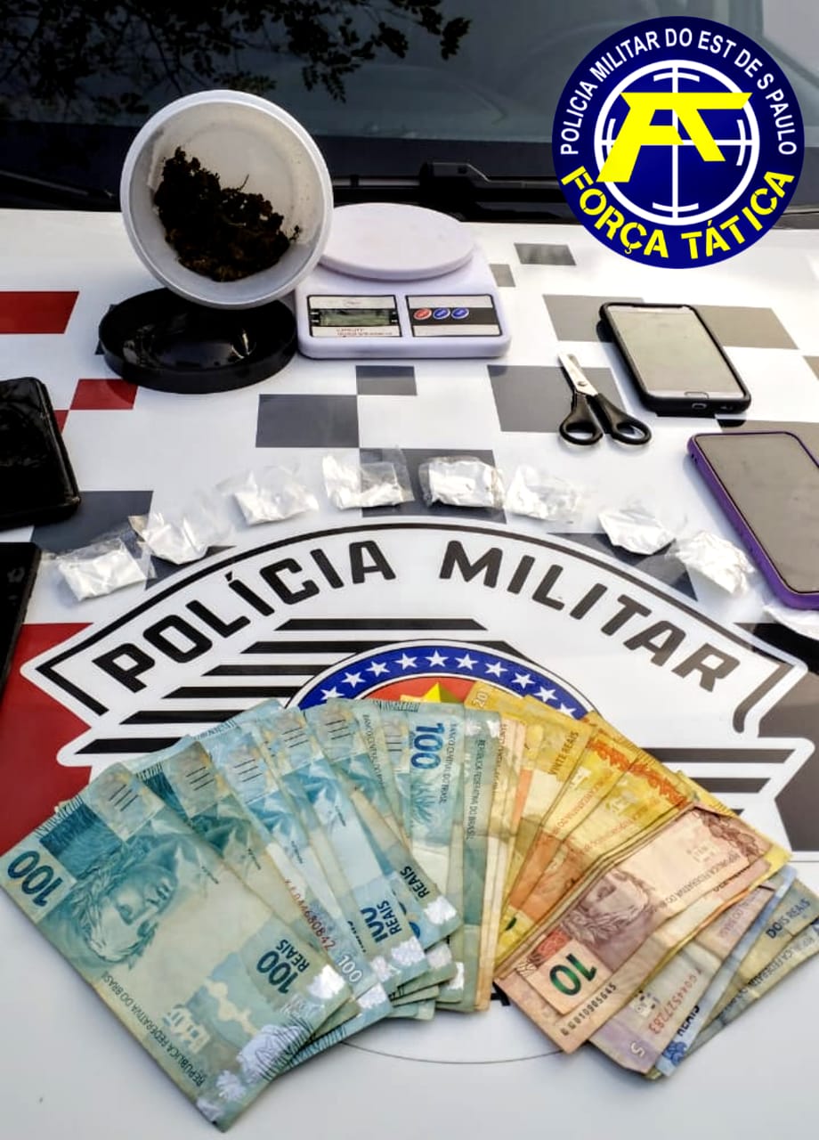 Na presença da namorada do responsável pela residência, a Força Tática efetuou a vistoria do local e encontrou nove papelotes de cocaína prontos para a venda; maconha; uma balança de precisão; tesoura e R$ 2.203,00 em notas diversas.