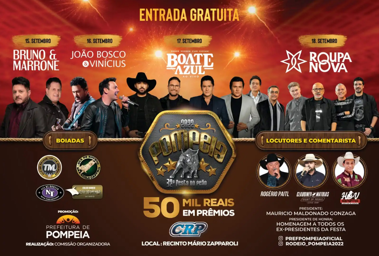 A 32ª Festa do Peão de Pompeia começa nesta quinta-feira (15) após dois anos de suspensão em decorrência da pandemia de Covid-19.