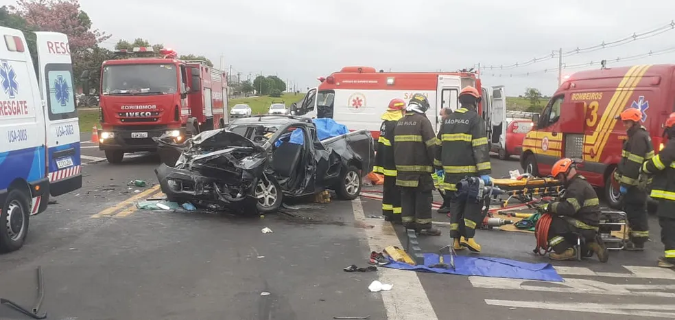 Após a batida, o motorista do carro ficou preso às ferragens, e equipes do Corpo de Bombeiros, do Samu e da polícia ajudaram na retirada da vítima do automóvel.