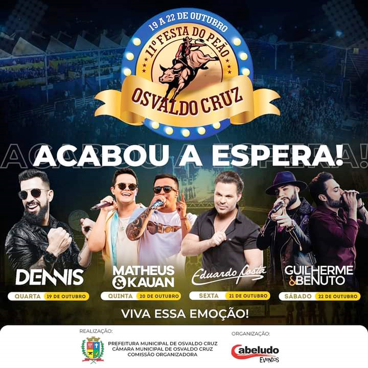 A comissão organizadora da 11ª Festa do Peão de Osvaldo Cruz anunciou a realização do evento, que acontecerá no período de 19 a 22 de outubro com entrada franca em todas as noites. A divulgação ocorreu por meio de uma live no Facebook, no final do mês de setembro.