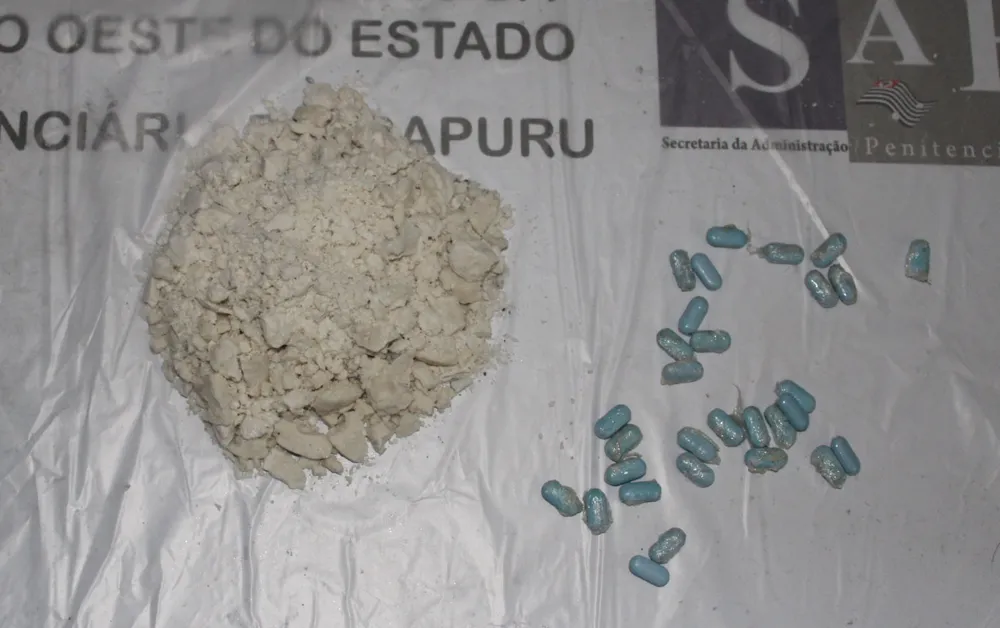 Ao ser questionada, a mulher confirmou que portava um invólucro e o entregou em local reservado às policiais penais. Ainda conforme a SAP, dentro da embalagem continha uma porção de substância branca, semelhante ao entorpecente cocaína, e 30 comprimidos de cor azul, aparentando ser estimulantes sexuais. O material foi apreendido.