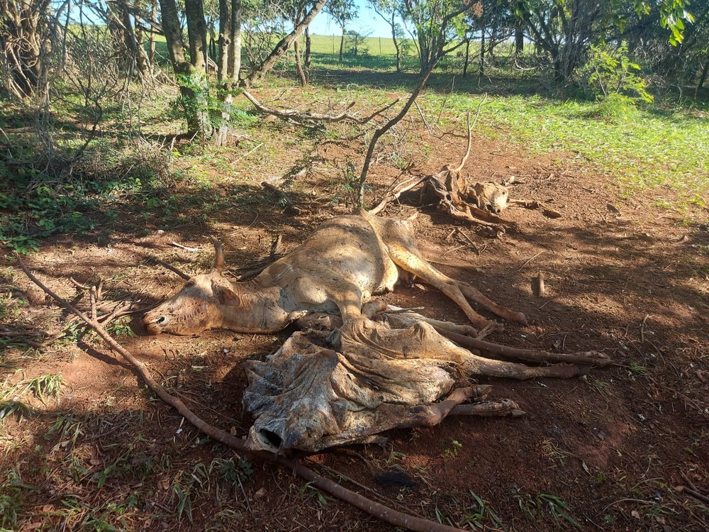 Os policiais foram acionados para a averiguação de uma denúncia anônima e, quando chegaram à propriedade rural, constataram que havia 32 bois já mortos espalhados pela área de pastagem da fazenda.