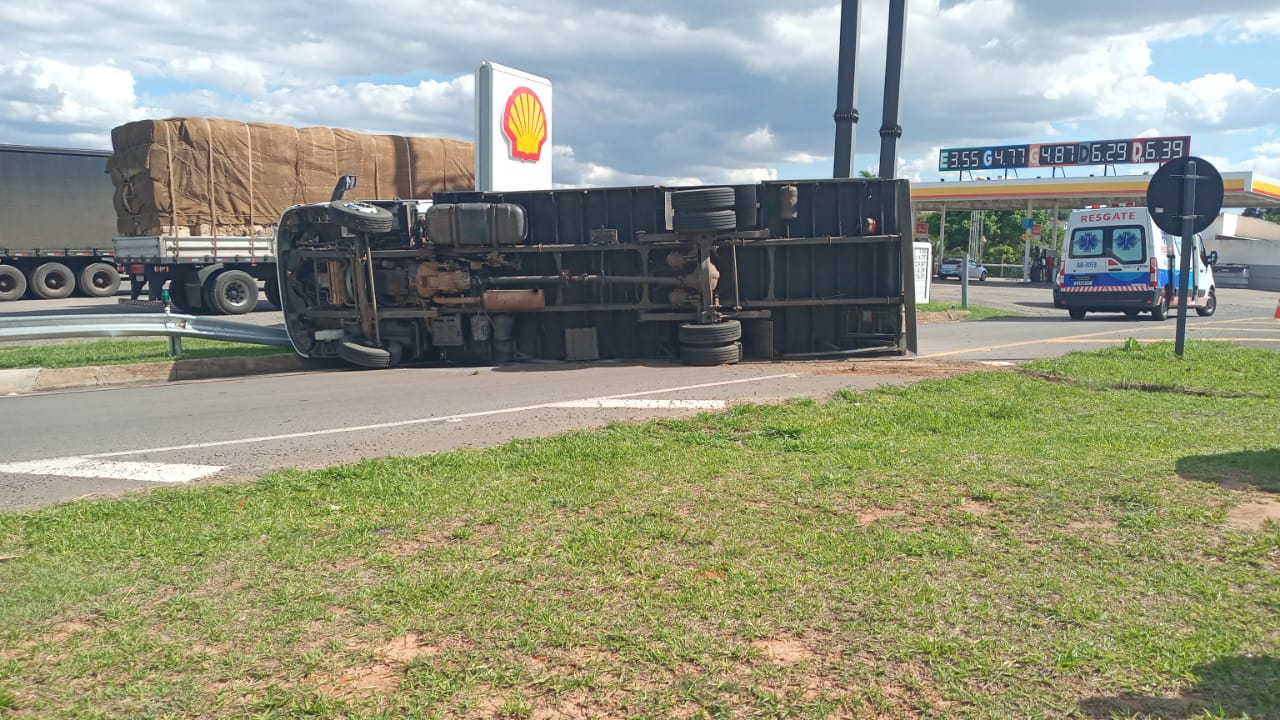 O acidente aconteceu no trevo que dá acesso ao Cemitério Municipal, quando por motivos ainda desconhecidos, houve o tombamento do veículo que estava carregado.