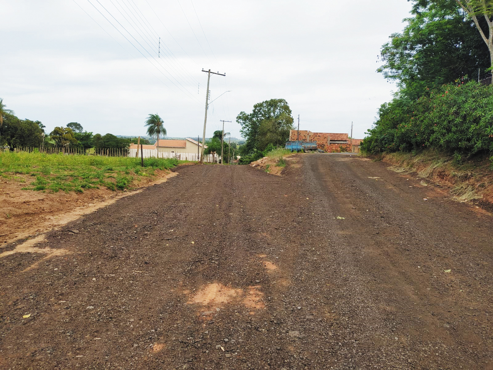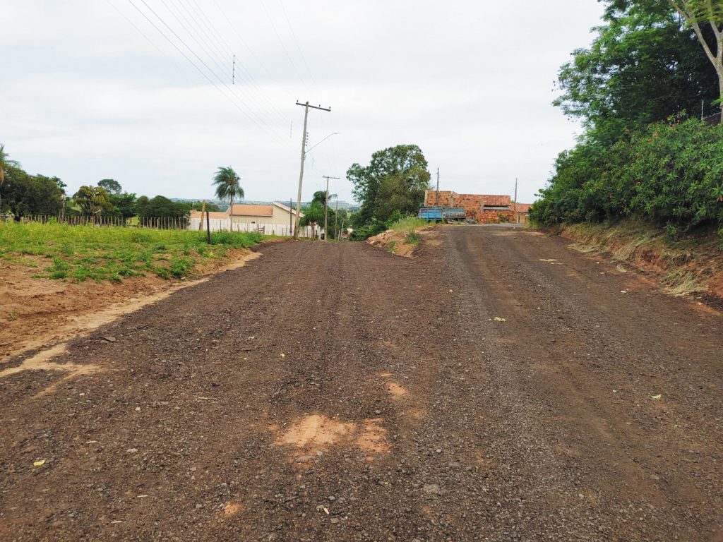 Antecedendo a aplicação do material, a Prefeitura Municipal executa a terraplanagem da via, direcionamento do curso de águas pluviais e outras melhorias.