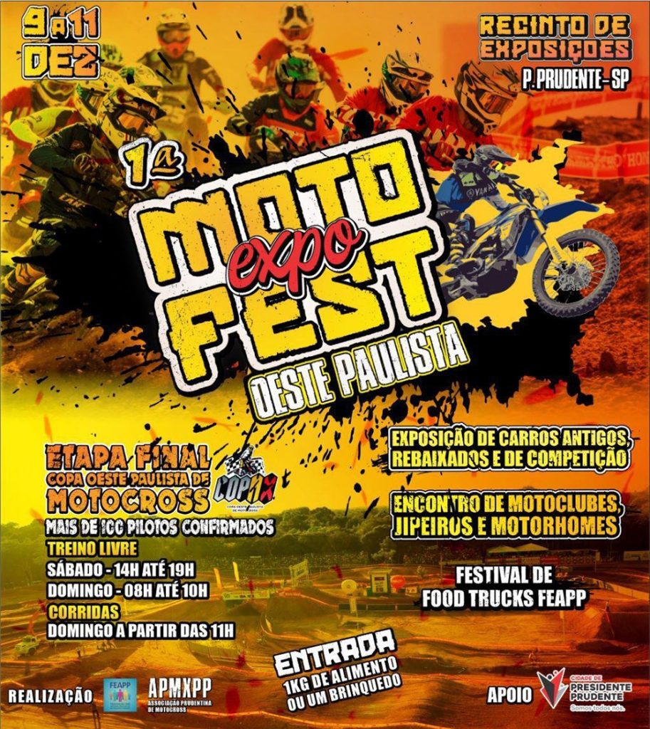 Neste fim de semana, dias 9, 10 e 11 de dezembro, no Recinto de Exposições “Jacob Tosello”, será realizada a Etapa Final da Copa Oeste Paulista de Motocross. O 1º Moto Expo Fest Oeste Paulista contará mais de 300 pilotos confirmados. No local terá exposição de carros antigos, rebaixados e de competição.