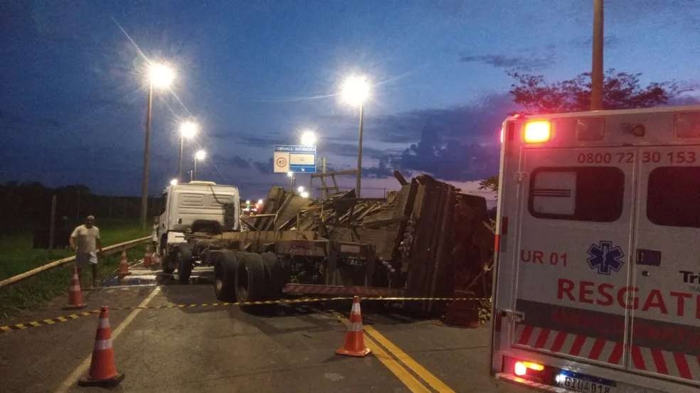 Um caminhão carregado com mangas tombou na Rodovia BR-153, próximo ao pedágio de Onda Verde (SP), na noite de sábado (10).