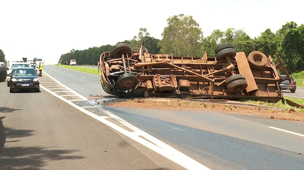 O tombamento de um caminhão carregado com serragem bloqueou o trânsito na Rodovia Cândido Portinari (SP-334) neste sábado (17) em Batatais (SP). O motorista ficou ferido.