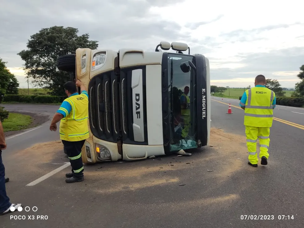 Uma carreta carregada com farelo de amendoim tombou na manhã desta terça-feira (7) na Rodovia Comandante João Ribeiro de Barros (SP-294), no km 547, em Iacri (SP).