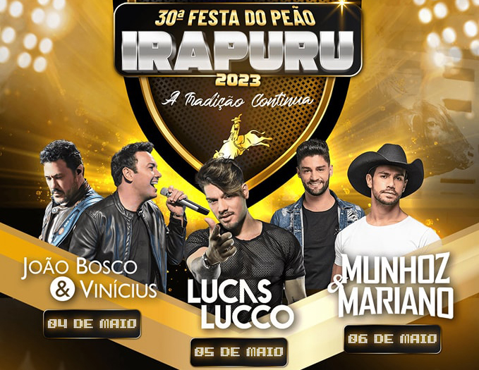 A grade de shows anunciada, mostra que o evento será o maior já realizado na história de Irapuru e terá na abertura no dia 4 de maio a sensacional dupla João Bosco & Vinicius; já no dia 5 terá a presença do cantor Lucas Lucco e no sábado o show terá a renomada dupla Munhoz & Mariano.