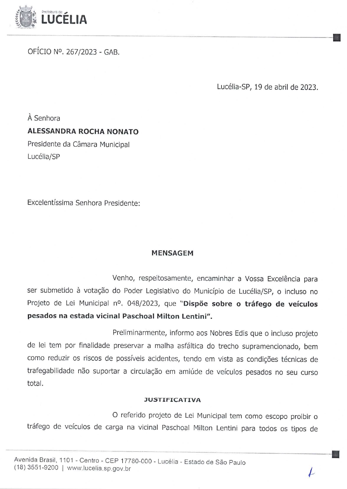 Confira abaixo o Projeto de Lei e a mensagem protocolada pela prefeita na Câmara Municipal de Lucélia: