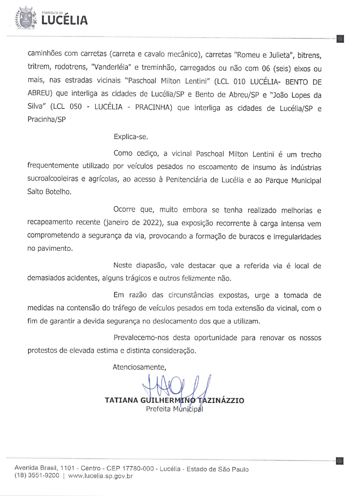 A prefeita de Lucélia, Tatiana Guilhermino solicitou a retirada de pauta do Projeto de Lei que previa a restrição de tráfego pesado com caminhões e carretas nas vicinais “Paschoal Milton Lentini” (LCL 010) que interliga as cidades de Lucélia e Bento de Abreu e “João Loés da Silva” (LCL 050) que liga as cidades de Lucélia e Pracinha.