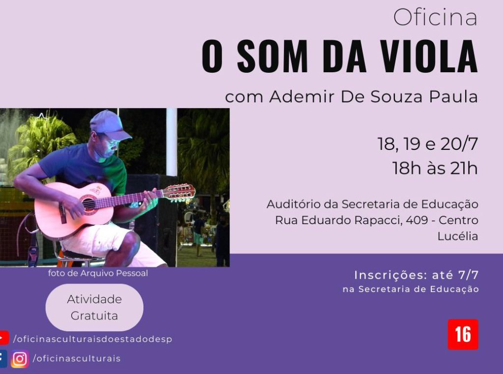 A Prefeitura de Lucélia por meio da Secretaria Municipal de Educação, Cultura, Esporte e Lazer está com inscrições abertas para a oficina “O som da viola”, que será ministrada por Ademir de Souza Paula, no auditório da Secretaria de Educação entre os dias 18, 19 e 20 de julho.