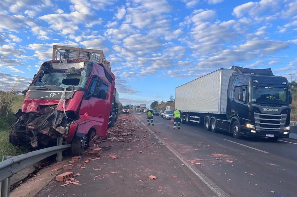 Com o impacto, parte da carga de tijolos ficou espalhada pela pista e uma faixa precisou ser interditada por uma hora e meia para limpeza da via e já foi liberada.