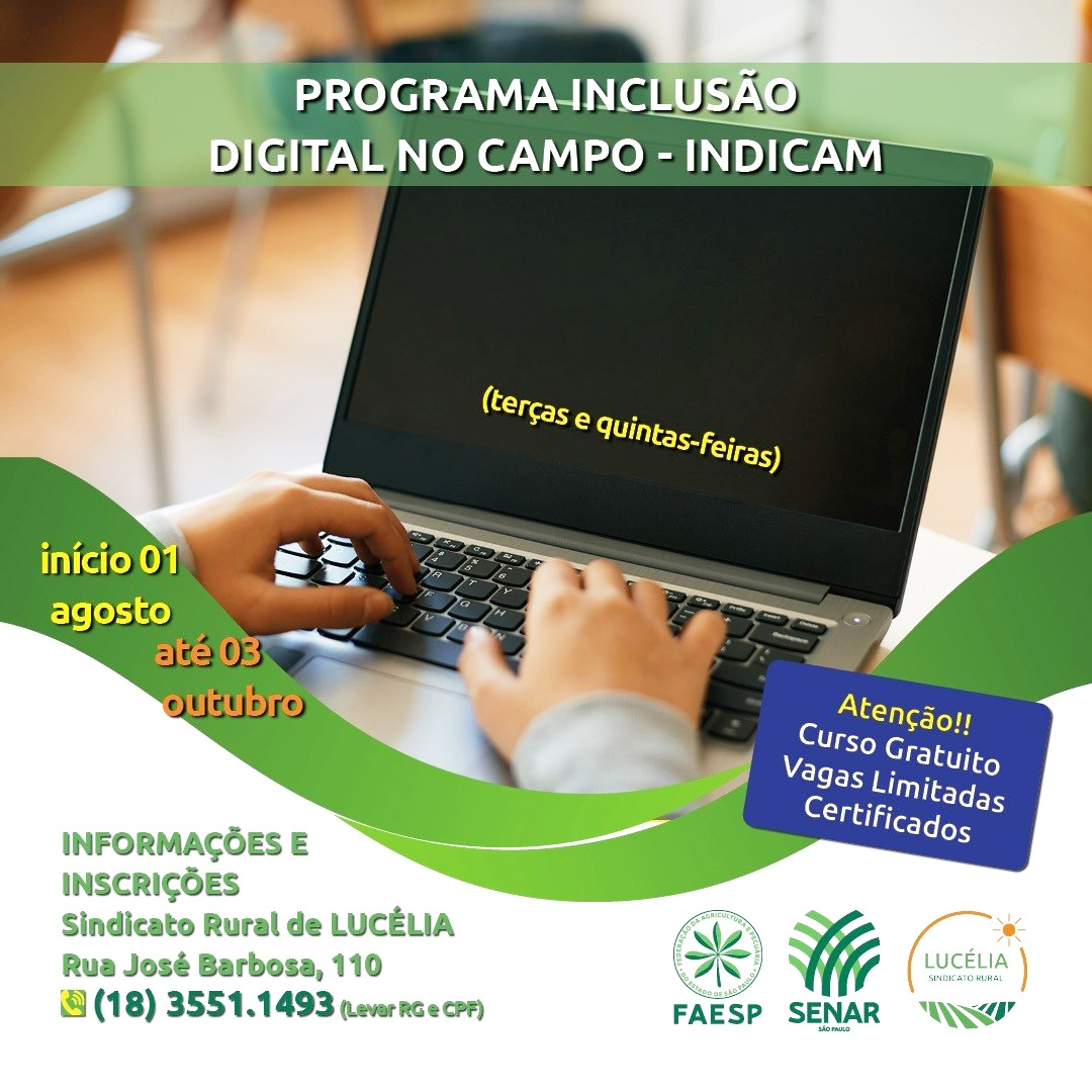 Para a inscrição no Programa Inclusão Digital no Campo – INDICAM, basta procurar o Sindicato Rural de Lucélia na Rua José Barbosa, 110 com o telefone (18) 3551-1493.