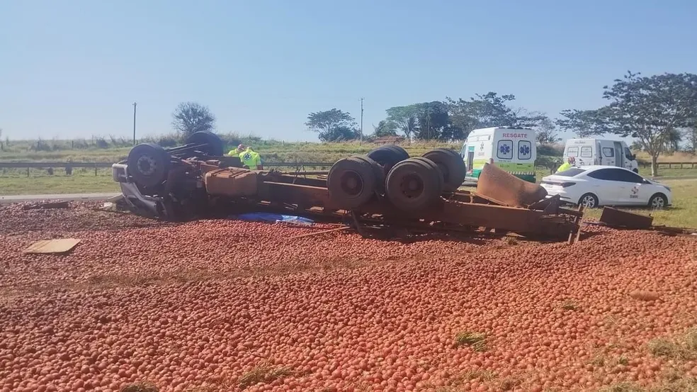 Segundo a Polícia Rodoviária, o caminhoneiro tentou evitar uma batida traseira contra outro caminhão, mas perdeu o controle da direção. Após tombar, o veículo foi parar no acostamento com as rodas para cima.