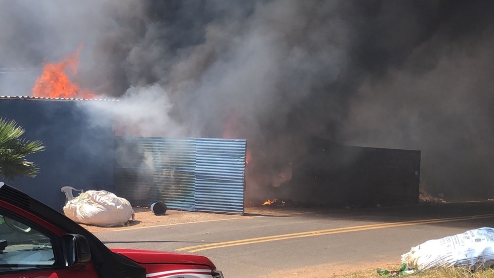 Um incêndio de grandes proporções atinge neste momento um depósito de materiais recicláveis em uma área próxima ao Distrito Industrial de Presidente Prudente entre as rodovias Assis Chateaubriand (SP-425) e Raposo Tavares (SP-270).
