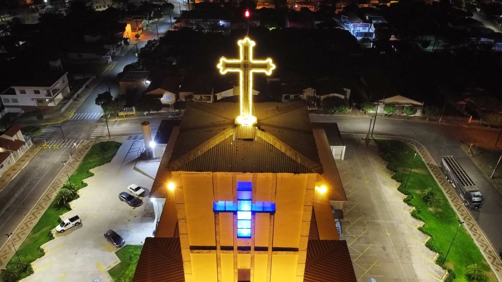 A cruz que fica no alto da torre da Paróquia Sagrada Família e que pode ser vista de vários pontos da cidade, voltou a ter a iluminação acesa no período noturno.