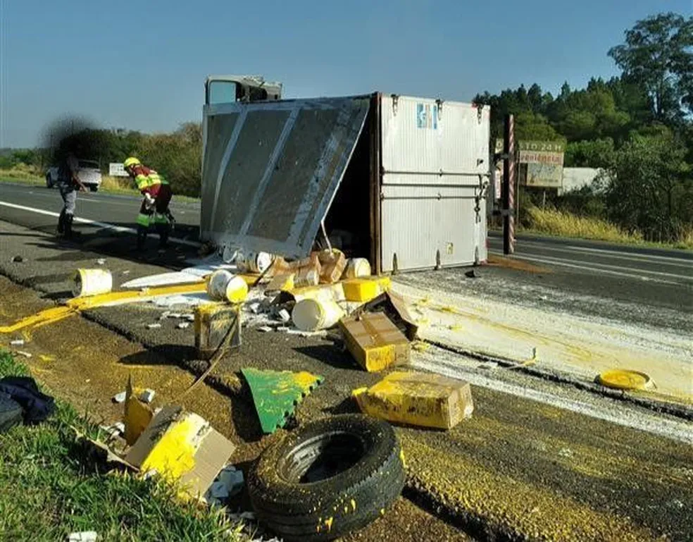 Um caminhão carregado com tinta látex tombou e deixou o motorista e o passageiro feridos na Rodovia Castello Branco (SP-280), em Tatuí (SP), na manhã desta segunda-feira (11).