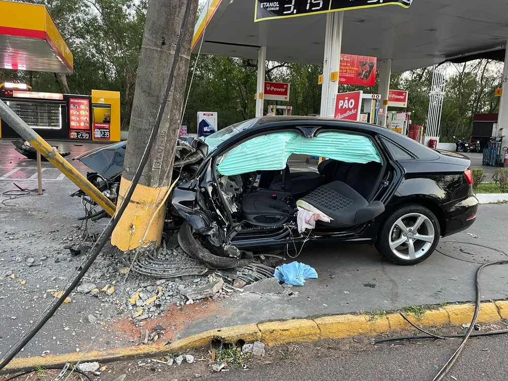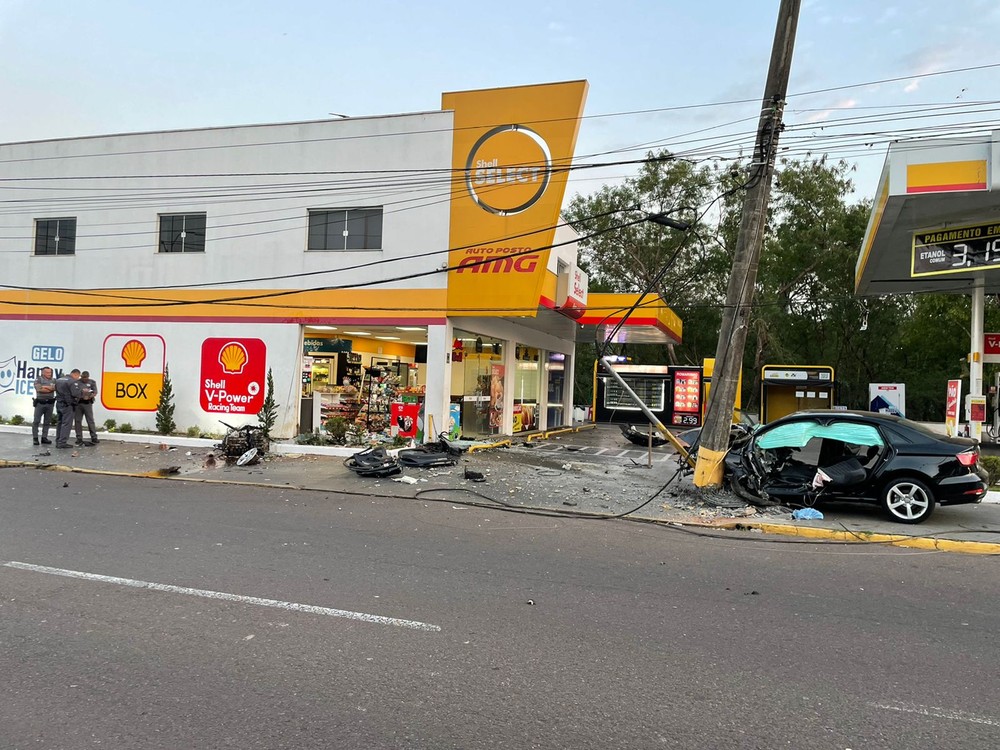 Com a força do impacto, o motor do automóvel foi arremessado cerca de oito metros para fora e atingiu uma conveniência localizada em um posto de combustíveis.