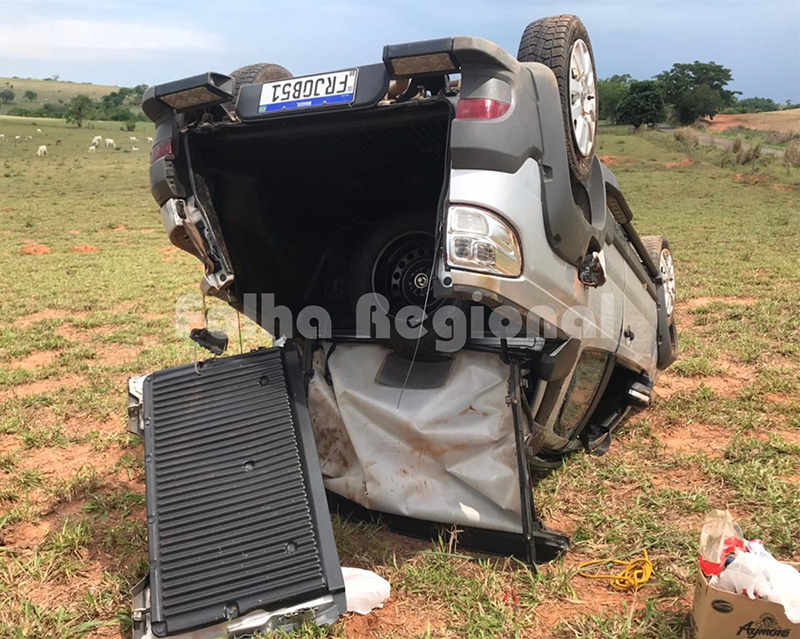 Após atingir a cerca, veículo capotou e parou com as rodas “para o ar” no meio do pasto.