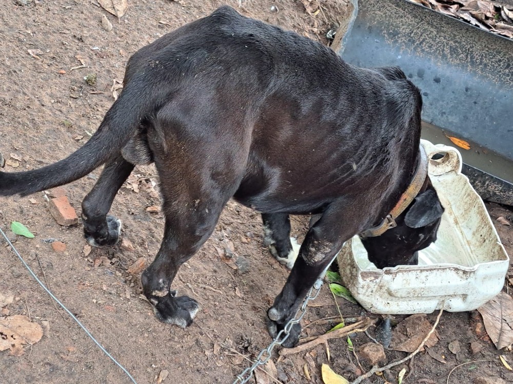 Após denúncia de que o animal estava sem água, sem comida e com ferimentos, a Polícia Militar Ambiental se deslocou até a residência e constatou que, para além do que já havia sido informado, o cachorro estava sem abrigo e com sinais de magreza excessiva.