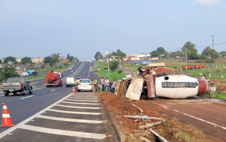 Um caminhão carregado com cimento tombou, na tarde desta sexta-feira (3), na via de acesso à Rodovia Comandante João Ribeiro de Barros (SP-294), sentido Marília-Bauru, pouco antes da Coca-Cola. Ninguém se feriu.