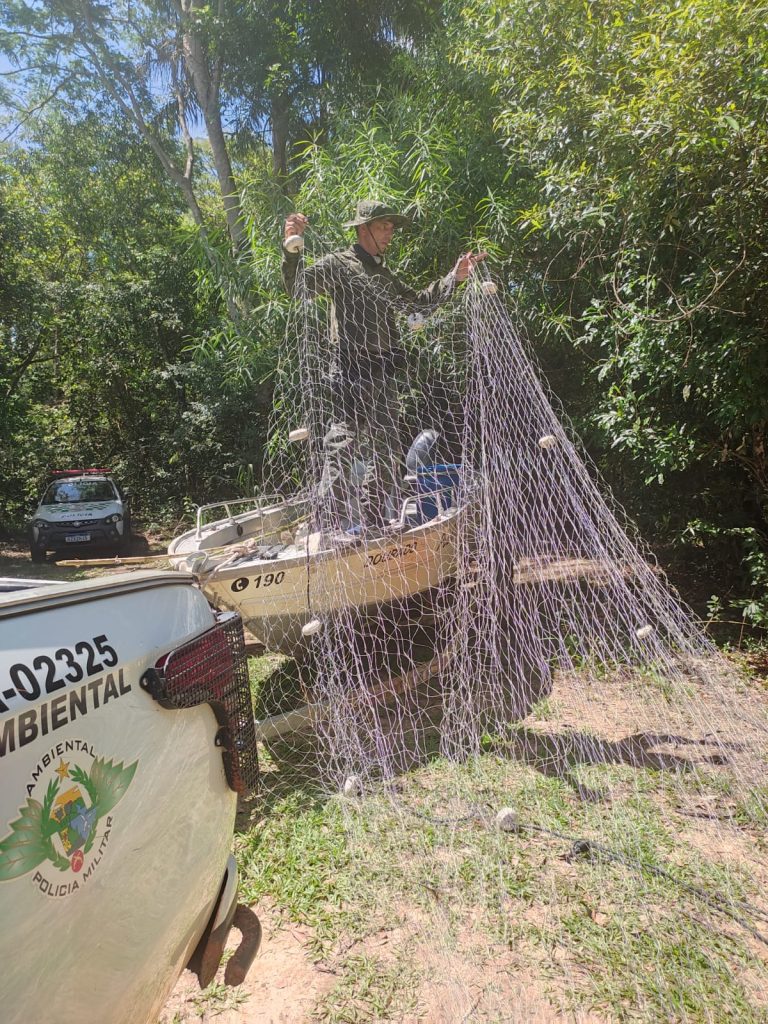 Hoje (30) durante Operação Piracema uma equipe da Polícia Militar Ambiental realizou policiamento náutico no Rio Aguapeí, jusante da cachoeira Salto Botelho no município de Lucélia e acabou por realizar algumas incursões na mata ciliar do referido manancial, achando um saco de ráfia contendo em seu interior uma rede de pesca molhada.
